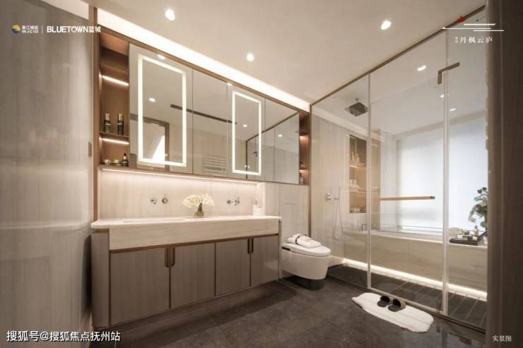 卫生间更是采用天然奢石,阿玛尼棕天然大理石、斜纹白沙大理石共同打造,奢华尽显。并配置暗藏墙出水龙头、暗藏恒温花洒、智能壁挂马桶等品质用品,细节上选用市面少有的双台盆、美妆冰箱、电热毛巾架等,更具人性化。