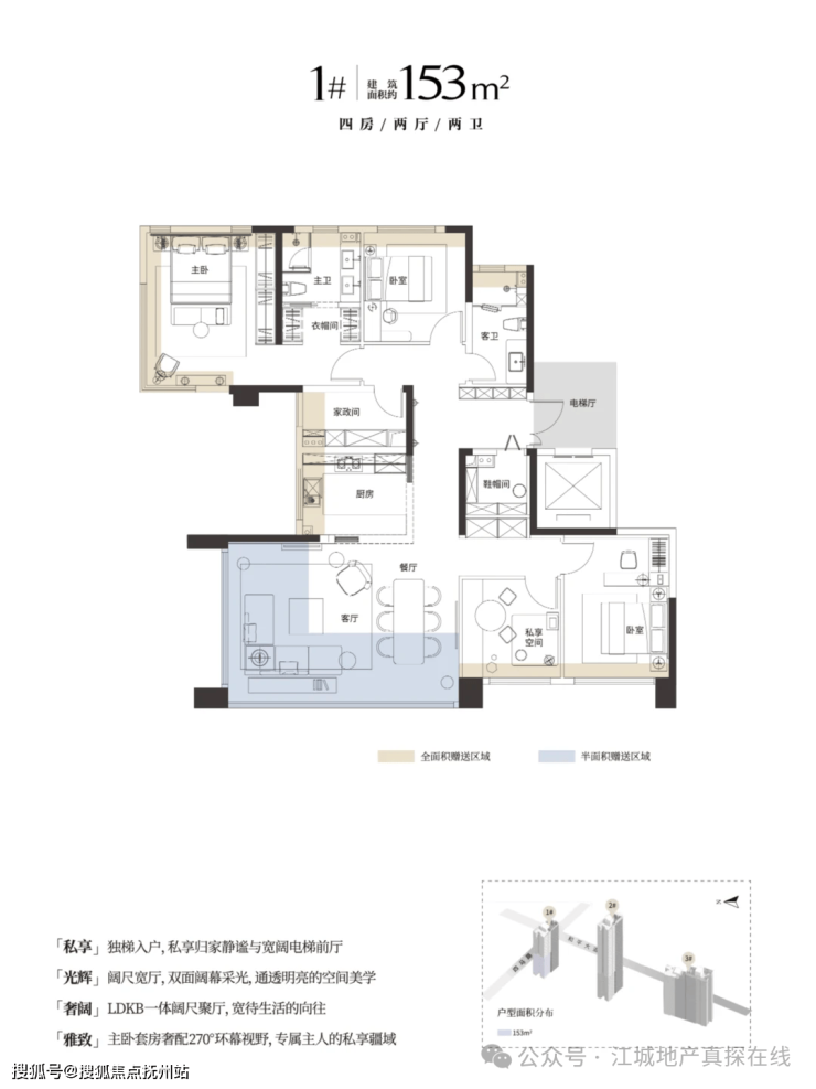 该户型为1号楼高层西边户,和建面约153㎡整体布局一致。