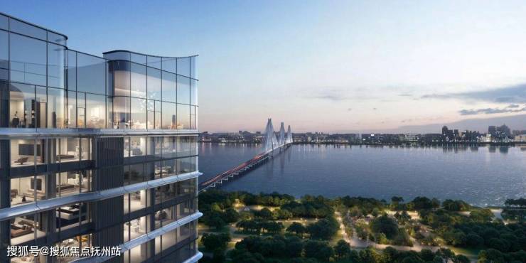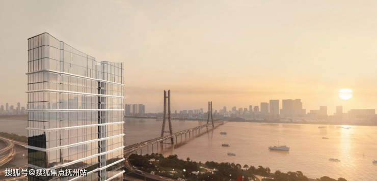 无背立面纯玻璃幕墙体系,公建化城市界面感,突破传统建筑棱角分明的边界感,以360°环幕落地玻璃幕墙体系,搭配横向金属铝板线条造型,阳台外侧采用超大玻璃分隔,保证看江面视野,阳台地面与室内无高差化处理,地暖通铺至阳台;阳台转角柱采用型钢柱设计,通过加强结构强度尽量减少柱截面,不浪费每一寸江景资源。