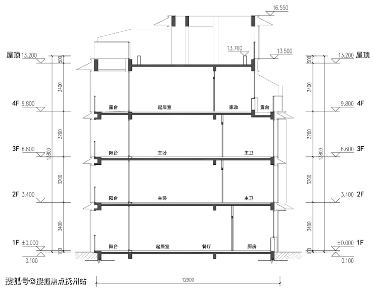 我以前一直不建议买叠拼,原因就是开间太小,但现在的叠拼基本解决了这个问题。这次姚江润园的叠拼,开间来到了约11.5米,客厅开间约7.7米。包括他的层高,也比以往的叠拼要高,下叠首层层高约3.4米,二层约3.2米。上叠因为做了倒置处理,所以是二层约3.4米,一层约3.2米(下图)。这个自己理解一下,是现在很流行的做法,避免了业主去顶楼露台还需要经过卧室区的问题。所以说,现代叠拼的空间尺度感是拉满的,完全配得上“”的说法。