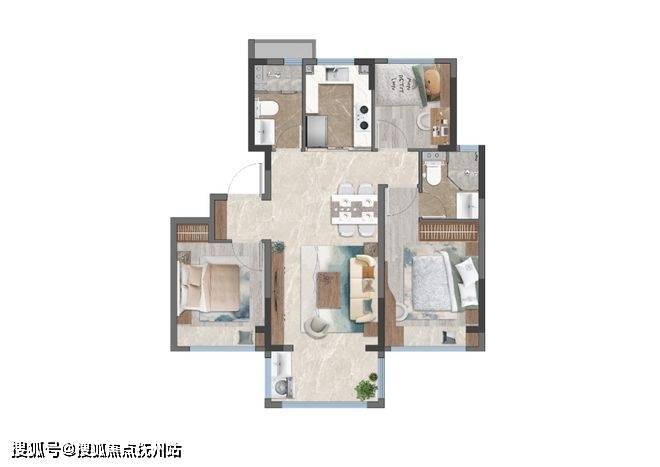 所以,这个户型从面积段上来看是建面约95㎡的紧凑型3房,但整体室内的各个空间都并不拥挤。