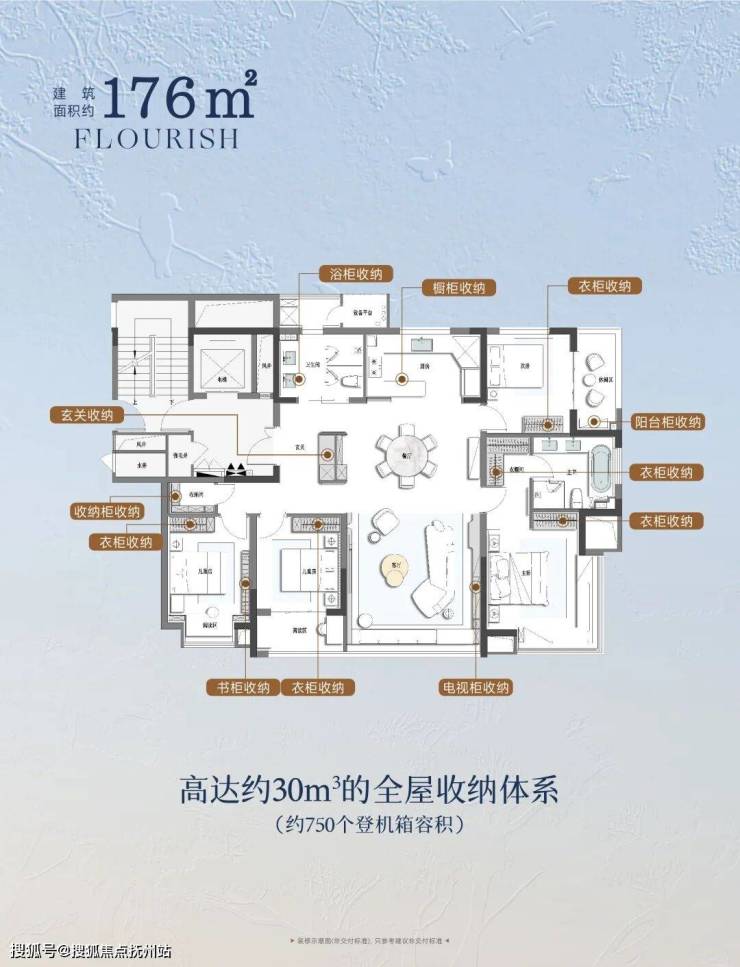 于是轨交·和晏府以建筑面积约176㎡户型为例,构建了高达约30m³(约750个20英寸登机箱容积) 的全屋收纳体系。(20英寸:0.35x0.2x0.5m≈0.035m³)