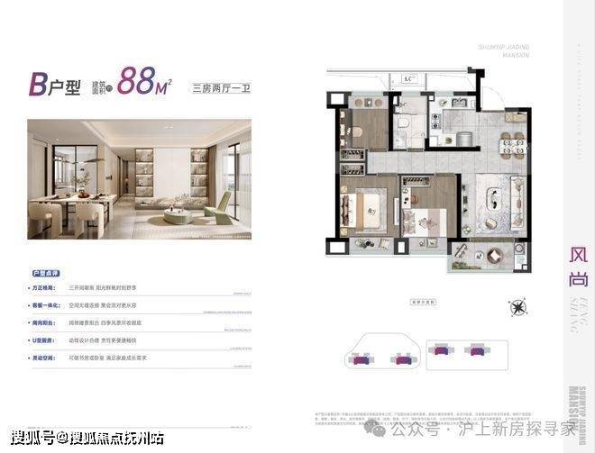 深嘉上府约88㎡户型,将三房两厅一卫的布局打磨得非常成熟。
