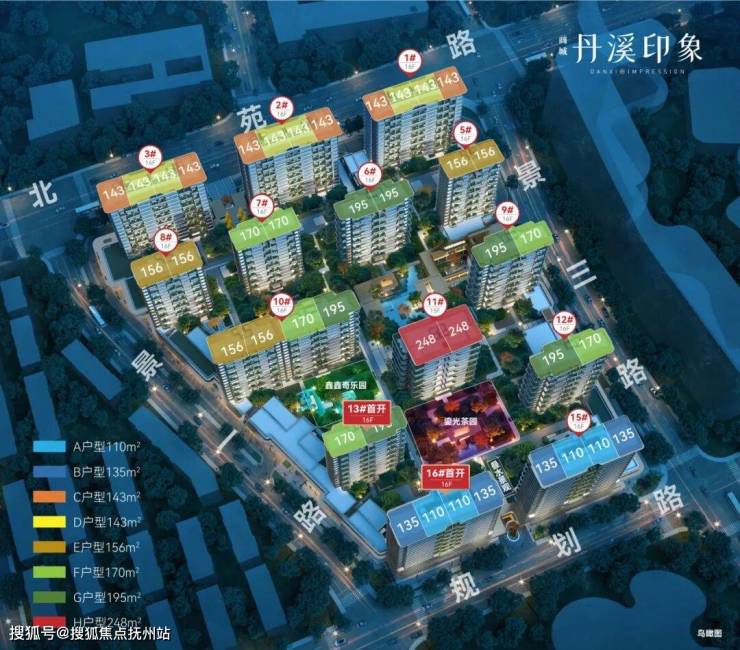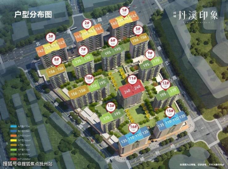 丹溪印象项目总建筑面积148894.95㎡,地上计容面积100476.95㎡,地下计容面积48418.00㎡,容积率2.37,建筑密度30%,绿地率30%,地块规划14栋高层住宅,其中13栋为16层,1栋为15层。
