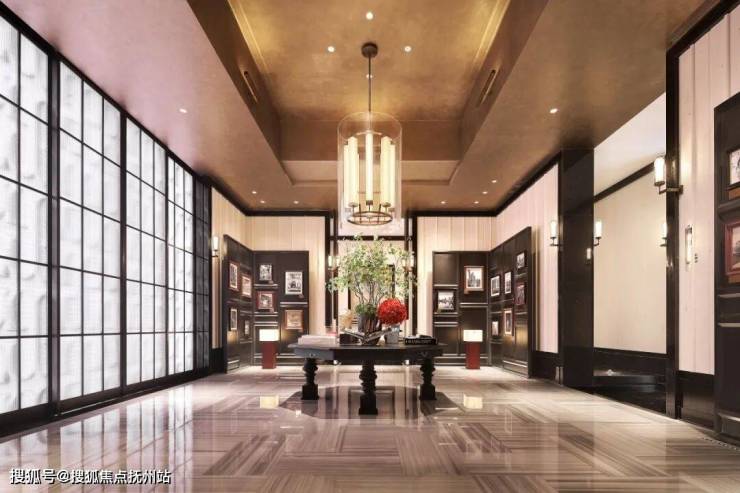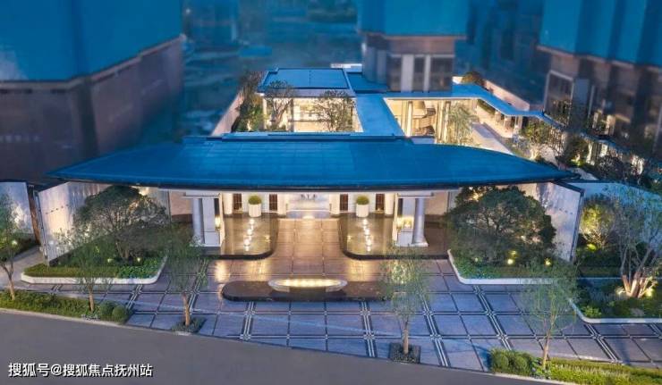 下沉庭院以约6.15米高的悬挑水帘、水中下沉卡座,构筑行走于水上的通行体验,与地下配套用房对话。地上地下的双园驱动,以直径约2.5米的雅典黑金花水钵为起点,以直径约2米的黄金麻整石水钵为终点,通过金澜线条的延续,串联景观故事线,回应湖映金沙的营销价值。