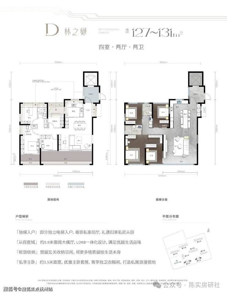 2号楼共39层,3梯4户,中间户建面约115平,边户建面约129平,是比较标准的户户带独立电梯前室、多阳台、多飘窗的准四代住宅。