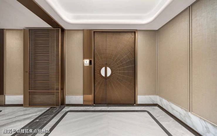 没错,元序出场就是板块首个!板块内首个豪奢大门,由设计大师孟凡浩创作的光环门廊,超百米宽、近11米挑高,中央动态艺术装置“揽星舟”,两侧约8米加纳利海枣与约5米塔形罗汉松,一眼望去豪奢大气,业主倍有面子。