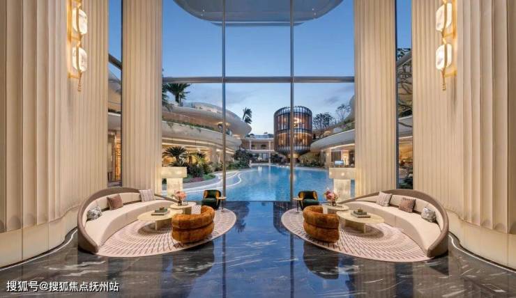不止于此,元序居然花费重金做到奢石满配:中央车马厅层墙面局部采用雪花白奢石,池壁为巴西利亚黑奢石,池底铺进口黑金砂,溢水台面选用“绿野仙踪”奢石,大堂月光米黄石材,有些地面铺上了太古黑金石材,蓝水晶石材背景墙…