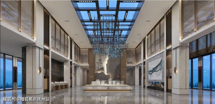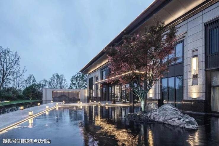 林荫花境的出口,薄雾缭绕,拨开云雾,一派山水府苑的尊荣气度展现开来。销售中心前,景观设计结合项目案名中的关键字“澜”,在前场打造富有张力的巨幅镜面水,抽象转译出的璧山景墙,围合的层次绿植,相映的轻幽白云,凌水铺挑的折道共同营造出“云水共一色,人在镜中游”的情境氛围。