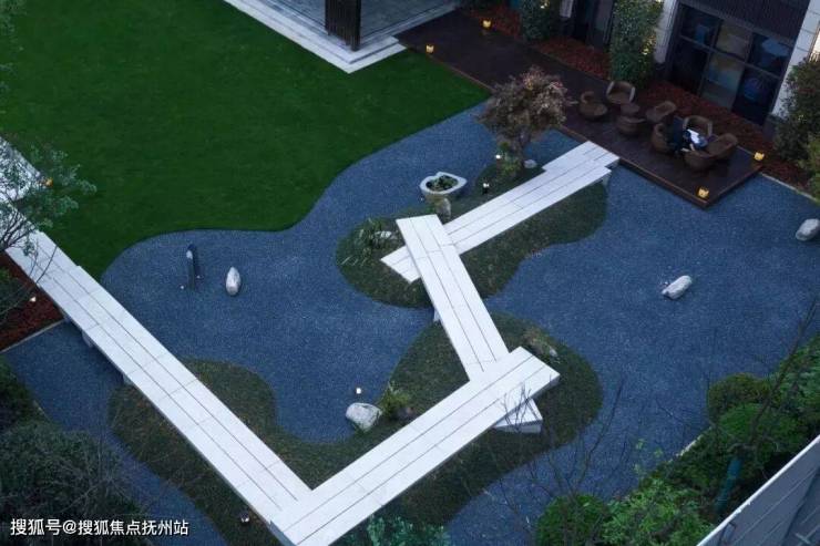 后庭紧挨建筑左侧散铺白沙意为水,绵延绿坡意作岛屿、山峦,犁出的白沙纹泛为涟漪 ,折桥如人生际遇之起伏,连接南北交汇空间,“乘物以游心”是禅文化与美学的具象表达。
