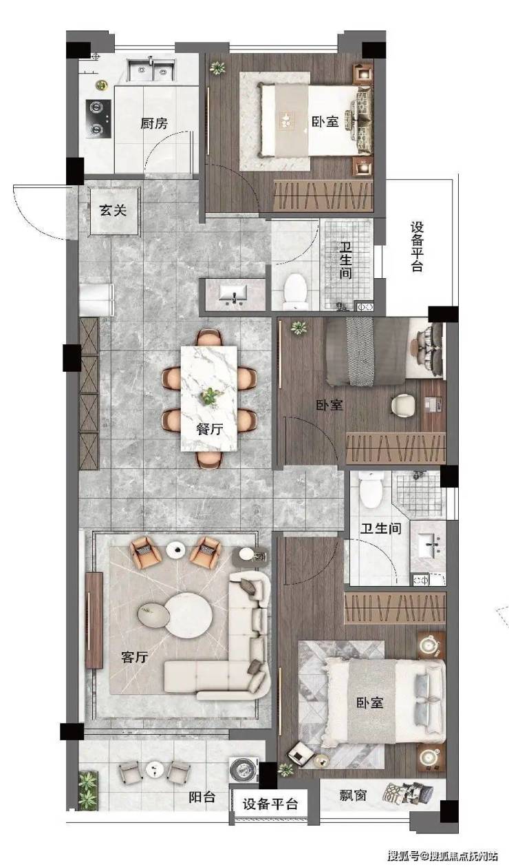 A户型:建筑面积:约102㎡ 三房两厅两卫