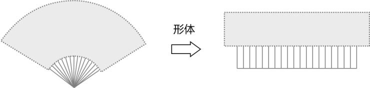 提取扇面竖向匀质排列的肌理应用在建筑上层。