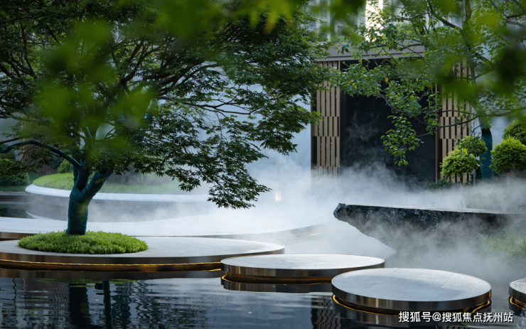 沿街面打造沉浸式的景观界面,外向式布局凸显仪式感。示范区入口营造开合有致的空间,门扉半掩更是是江南婉约美的体现。庭院通过大面积水景打造开阔的空间,体现水乡特色, 营造豁然开朗的视觉体验。