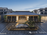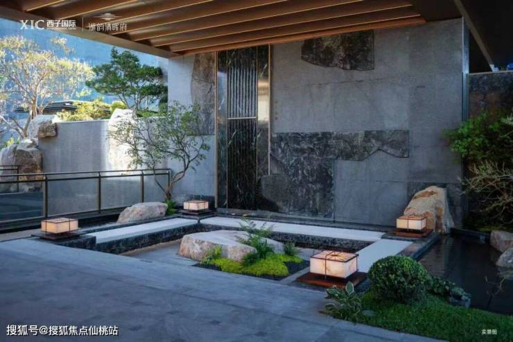 「一进」是一幅约11米高的大门,人字坡屋檐和金镂格栅造型交织出了浓浓的东方意境,两边的奢石景墙、名贵黑松和大块大块的太行金石,又透露着气派和贵重。