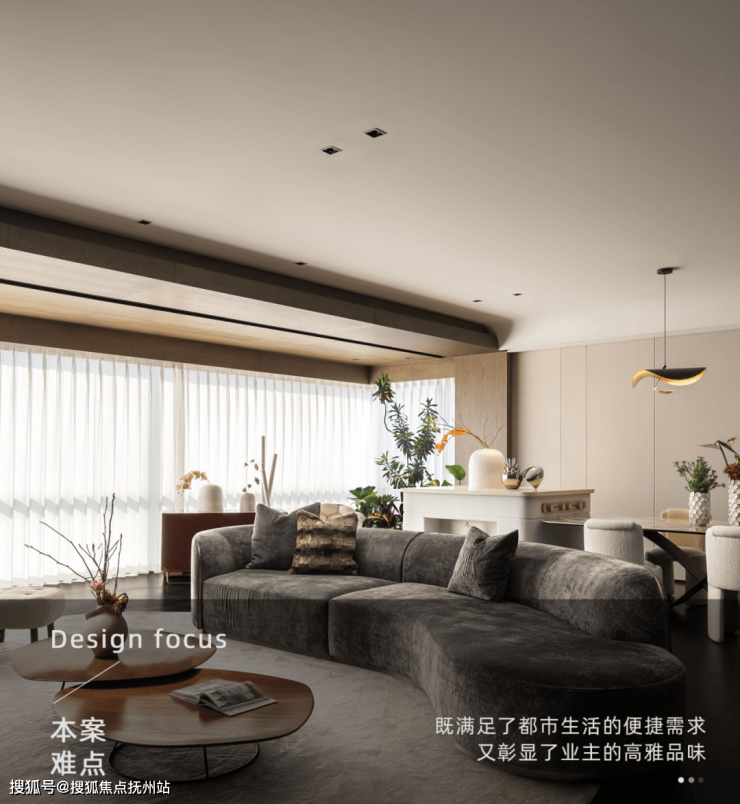 弧形灰色绒面沙发如优雅的艺术雕塑,柔化了别墅装修空间的棱角,其上的抱枕为空间增添了层次与质感。