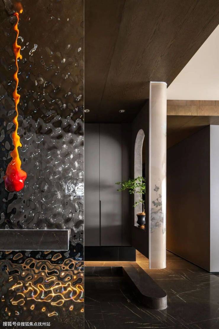 那悬挂的橙红艺术装置,以极具张力的造型,如岩浆滴坠、似火焰凝驻,在冷硬的金属背景前,成为视觉焦点,为别墅装修空间注入一抹炽热的艺术灵魂,让现代的先锋感与艺术的不羁感在此碰撞出奇妙火花。