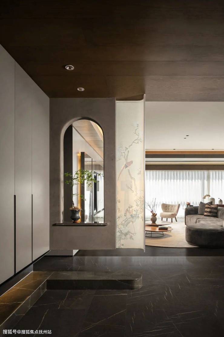 旁边的半透材质隔断,淡雅的底色,以花鸟为墨,绘就出中式传统的雅致图景,朦胧的质感似一层薄纱,将后方空间若隐若现地勾勒,既划分了区域,又保留了空间的通透与诗意,让东方美学的含蓄之美在此静静流淌。