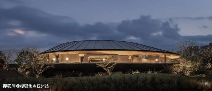 面对开阔的天然湖泊,仿「郭庄」之意,打造出临水而卧的「扇亭」会所,屋顶顺应湖岸像折扇一样向湖面打开长达53m,超宽尺度无肋玻璃面,视野所及,皆为景。