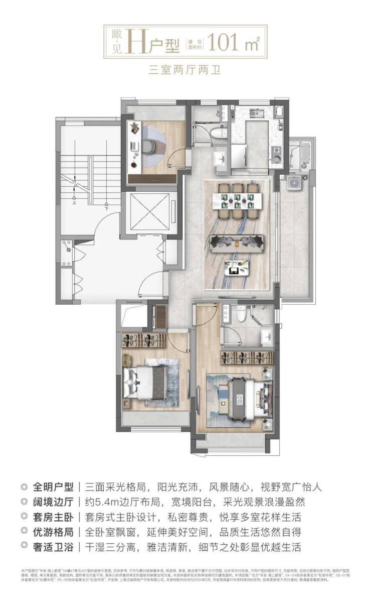 建面约101㎡H户型:三面采光,全能景观王炸边厅户型!