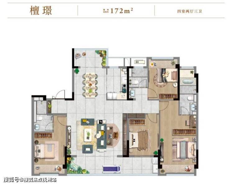 建面约172㎡四室两厅三卫 户型,不仅有和143㎡户型一样的端庄通透,还是其升级版配置!