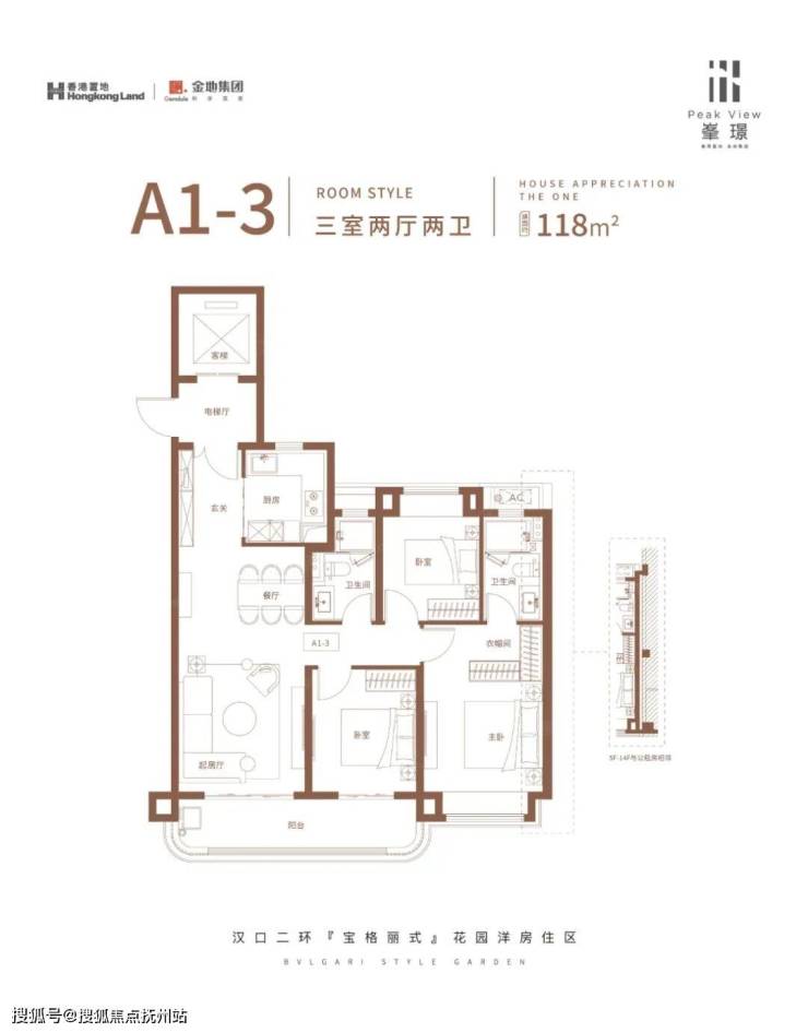 建面约112-118平 三房两厅两卫:连廊中间户,三开间朝南,北边对连廊,局部南北通透,北边空间私密性有一定影响。