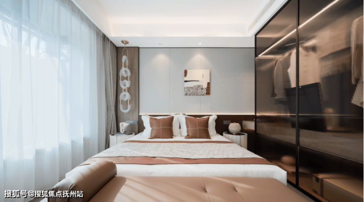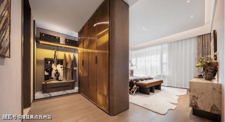 约10.4m“跑道式”瞰景阳台与南北双阳台系统,实现了景观欣赏与生活功能的高效分区。主卧270°寰幕飘窗将卧室变为观景舱,而雅致衣帽间的贴心布局,则在细节处诠释了有序、从容的世家生活哲学。
