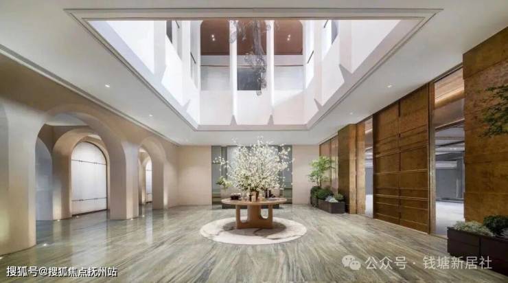 项目东方殿堂级别的公区设计,社区大堂中庭超7米挑空打通双层视野,12座拱形廊柱阵列环抱艺术装置,构成一座雅奢美学殿堂。