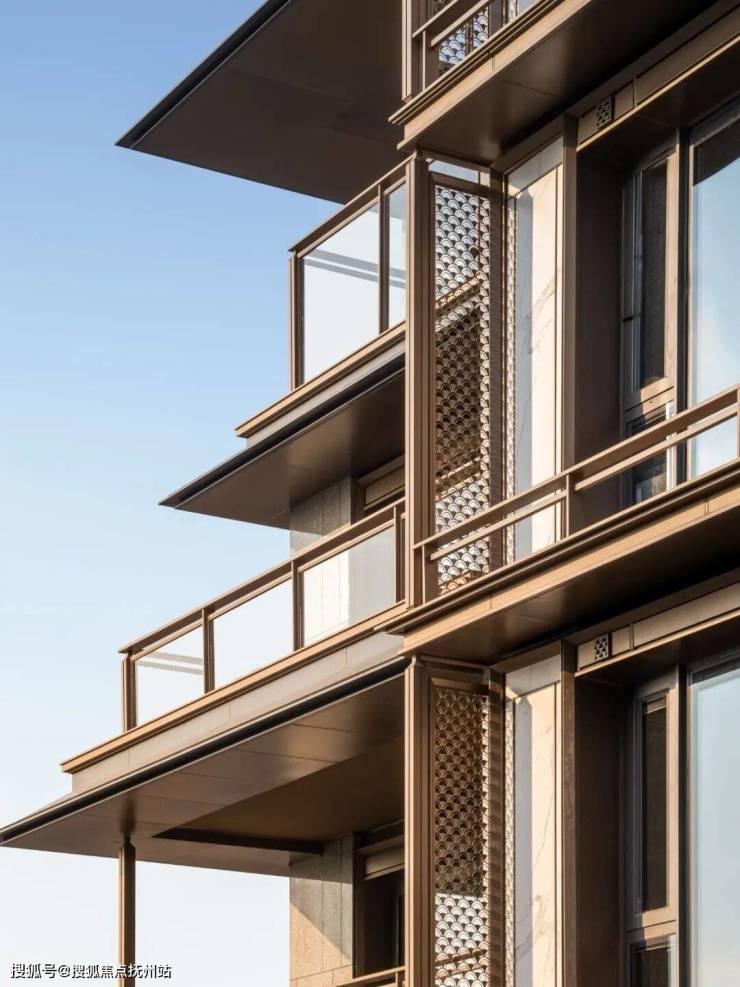 本项目的低多层住宅,化用龙光塔的层层重檐为现代的金属挑檐,既有东方韵味,又具有时代特征。立面以“石中藏玉”美好寓意,通过金属、大理石、香槟色金属线条、石材幕墙,呈现别具一格的风雅意韵。