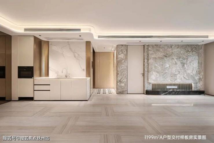 安第斯雪景奢石从玄关铺陈到电视背景,希腊木纹石材通铺地面,墙面是闪亮的影木。