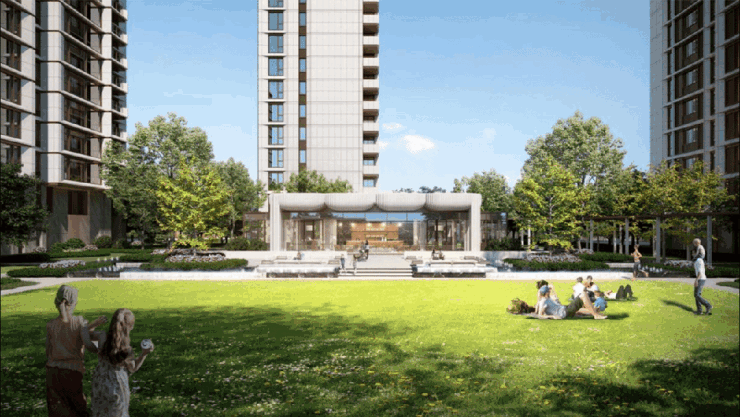 其中,不仅打造了以季节变化之美的四季大道景观轴、多重主题花园、滨河景观带,还在围合式的巨大社区中庭里打造了一座多功能会客厅。