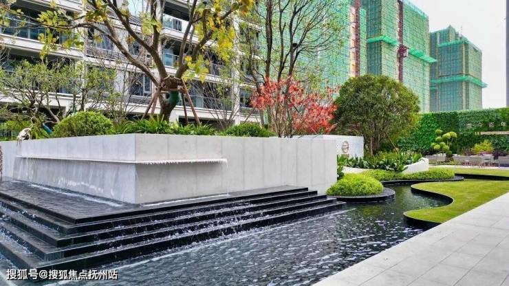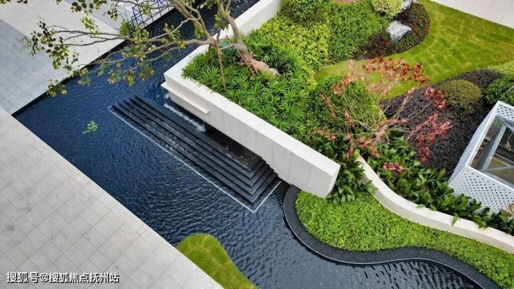 穿过大门,看到的是一方设计感十足的叠水景观。