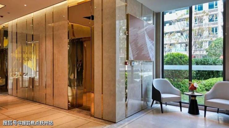 电梯是奥的斯品牌。电梯门框,采用香槟金金属包裹。