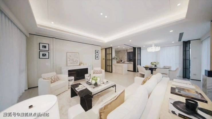 客厅与餐厅无界连通,沙发与餐桌仅一步之遥,亲友相聚时,笑声可从厨房飘至阳台;约270°环幕落地窗则以江天为幕,晨雾漫江时,光晕在纱帘上晕染成诗;夕阳西沉时,整面墙被染成琥珀色,室内空间如同镀上一层暖金。