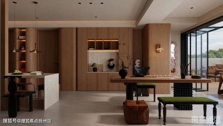客厅是融合自然质感与艺术氛围的开放式空间,以原木色为基底,搭配浅灰地面、黑色金属、墨绿色软包,在自然质朴中融入沉稳与活力,空间兼具休闲、展示与社交功能。