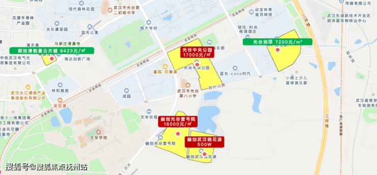 隔壁的光谷中央公园已经售罄(还有一些工抵房源),清盘阶段的特价房源是16000元/m²起,好楼层19000元/m²。