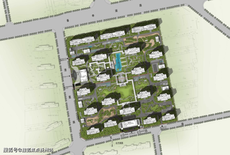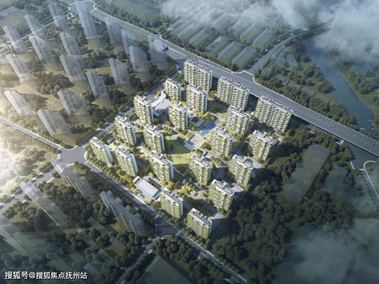 项目规划布置20栋高层住宅,层数在12F-17F之间。楼宇采用错位布局的方式,形成"城市森林岛屿"的视觉效果;在地块内部围合1000㎡下沉庭院花园,同时融入苏州园林造景手法,形成户户享有立体庭院景观,实现"推窗见绿"的生活体验。