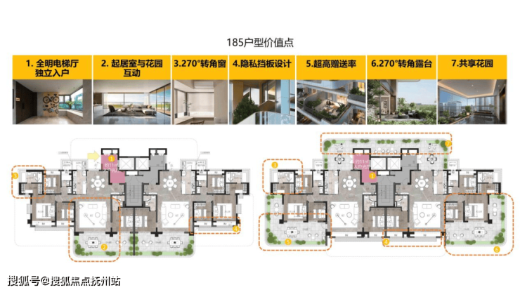 185㎡主力户型特点:全明电梯厅;270°转角空中庭院;转角景观窗;隐私挡板设计;起居室与空中花园互动。