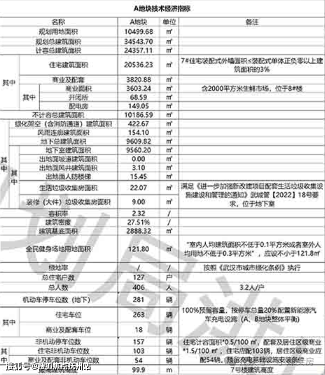 A地块规划用地面积约1万方,总建面约3.45万方,住宅建面约2万方,容积率约2.32,总户数127户,住宅机动车停车位263个。