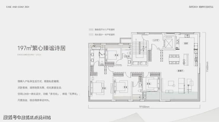 197㎡户型,四房两厅三卫,双套房设计;南向面宽高达19.1米,四面采光通风,通透性极佳;阳台进深约2.4米,双阳台加上多个飘窗,优化后得房率约95%,如果加上电梯前室的面积,得房率也可以做到接近99%。