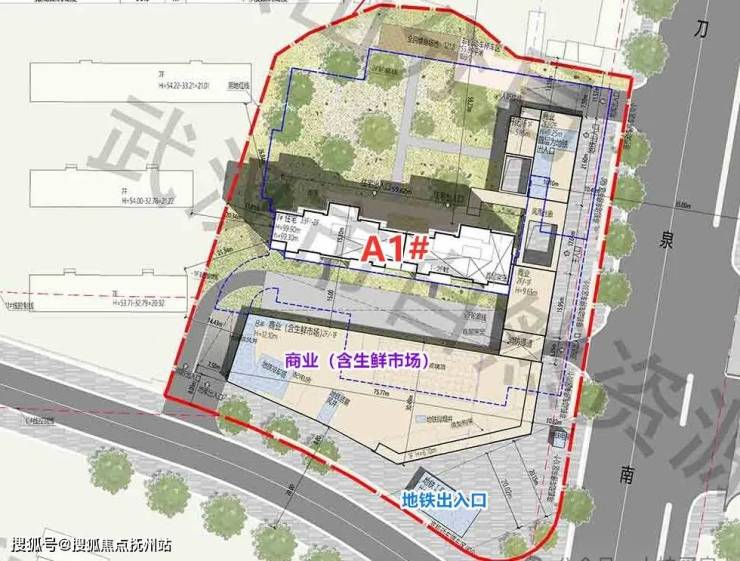 A地块还带有一个2000㎡生鲜市场,在地块的东南角还有一个地铁出入口。