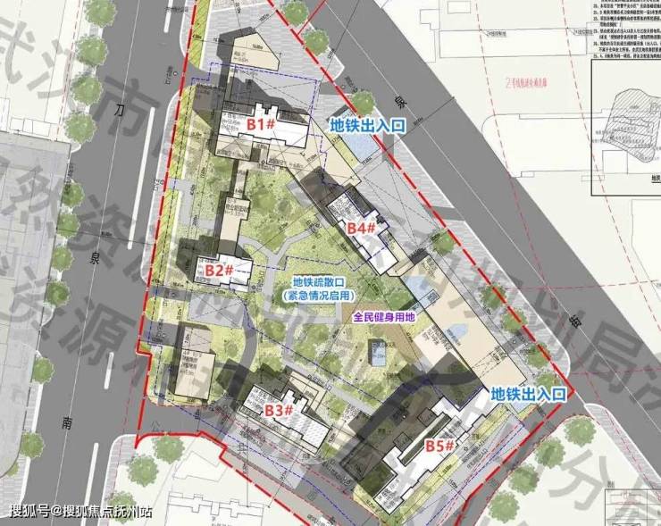 B地块有3个地铁出入口,真正的地铁上盖项目,其中地块内部的是地铁疏散口,平时关闭,紧急情况启用;此外在地块中间有个全民健身用地;项目的主入口位于卓刀泉南路,在B1#和B2#之间。