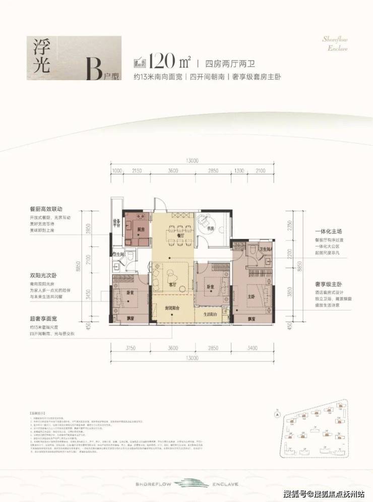 建筑面积约120㎡B户型,采用了四开间朝南的排布方式,总面宽约13米。三个卧室和餐客厅均朝南,让每一个空间都拥有南向阳光平权。餐客厅和次卧连接了一个双联大阳台,双飘窗,赠送面积多。而且客卫就在次卧边上,生活起居也是便捷不少。滨江兴耀·时舟里 销售电话:186-6709-7609√√【微信同号】