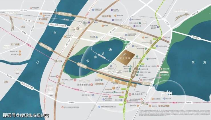 项目地块与中北路、沙湖大道为邻,快速通达全城。更一线直面沙湖全景,揽胜约10km湖岸线上的四季风情。华中金融主轴、武昌政务主轴、中央商业主轴三大主轴鼎立,周边多重商圈环绕,武汉SKP、楚河汉街近在咫尺,一城高阶资源精粹于此。