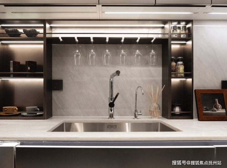 更具代表性的是137㎡户型的餐边柜,它与操作台、洗手台组合成复合工作站——咖啡机、蒸烤箱、酒柜、日常餐具按功能分层,把所有抽屉拉开,收纳空间的容量非常惊人。在这一方空间里,朋友小酌、业主轻烹......一张台面完成多场景无缝切换。