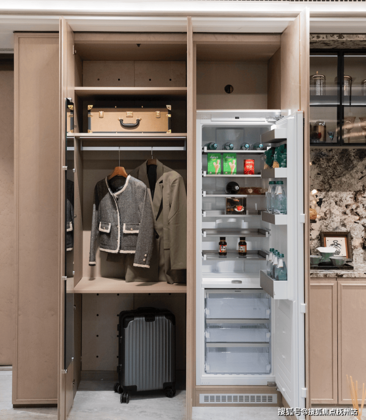 137㎡户型在此基础之上叠加 “雪山银狐”奢石壁龛,小件随手即归位,行李箱、滑雪板、登山杖等大件也有独立空间,抽拉、拿取都在一步之内。冰箱柜被巧妙“藏起”,维持立面干净统一。