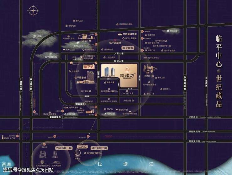 临平新芯:优踞临平新城核芯,也是杭州重点打造的城东新中心,紧邻临平新城管委会,直距临平区政府约1.6km,名副其实的行政中枢和临平CBD,堪称城市发展的价值引擎。