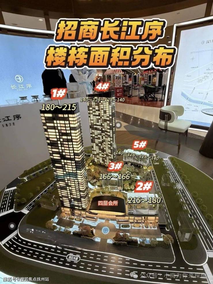 招商长江序占地约2.7万方,总建面约12.15万方,住宅约8.75万方,容积率约3.26,共约560套房源,户均建面约156平。定位纯粹高端改善。共计613个机动车位,车位配比约1:1.09。由5栋超高层组成,其中1、2号楼42层,3号楼45层,4、5号楼44层,1-3号楼为1个单元,4、5号楼为两个单元。总高大概都在42-45F。