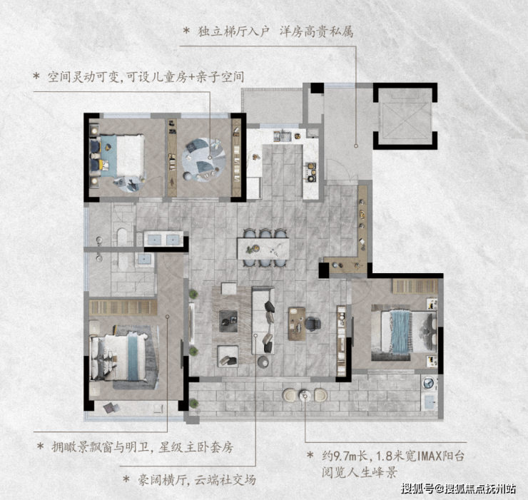 约9.7m长,1.8米宽IMAX阳台,加上约45㎡的大方厅,如此嘉兴市场开创性的设计,在保证采光及观景面更充足的前提下,让空气的对流也更加流畅,更大程度上提升了全屋的通透感。