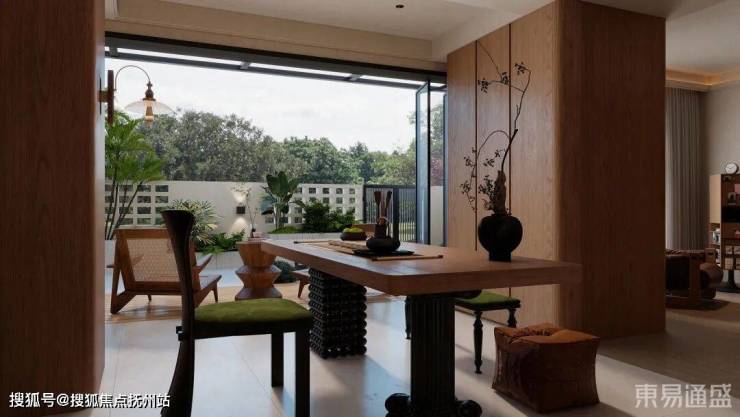 大玻璃门连通户外庭院,让室内外景致交融,自然光线与绿意大量涌入,营造出松弛的 “室内花园” 感。