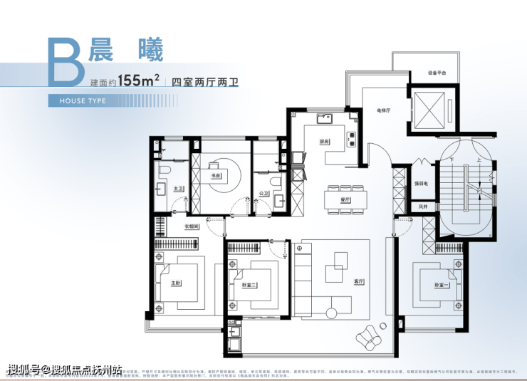 建面约155㎡,四室两厅两卫,两梯两户,270°观景电梯厅为家庭独享,空间阔绰。大宽厅+双联阳台+独立餐厅+南北5个飘窗,让本已奢阔的空间更加延展。作为起步大平层,这个户型让人眼前一亮。